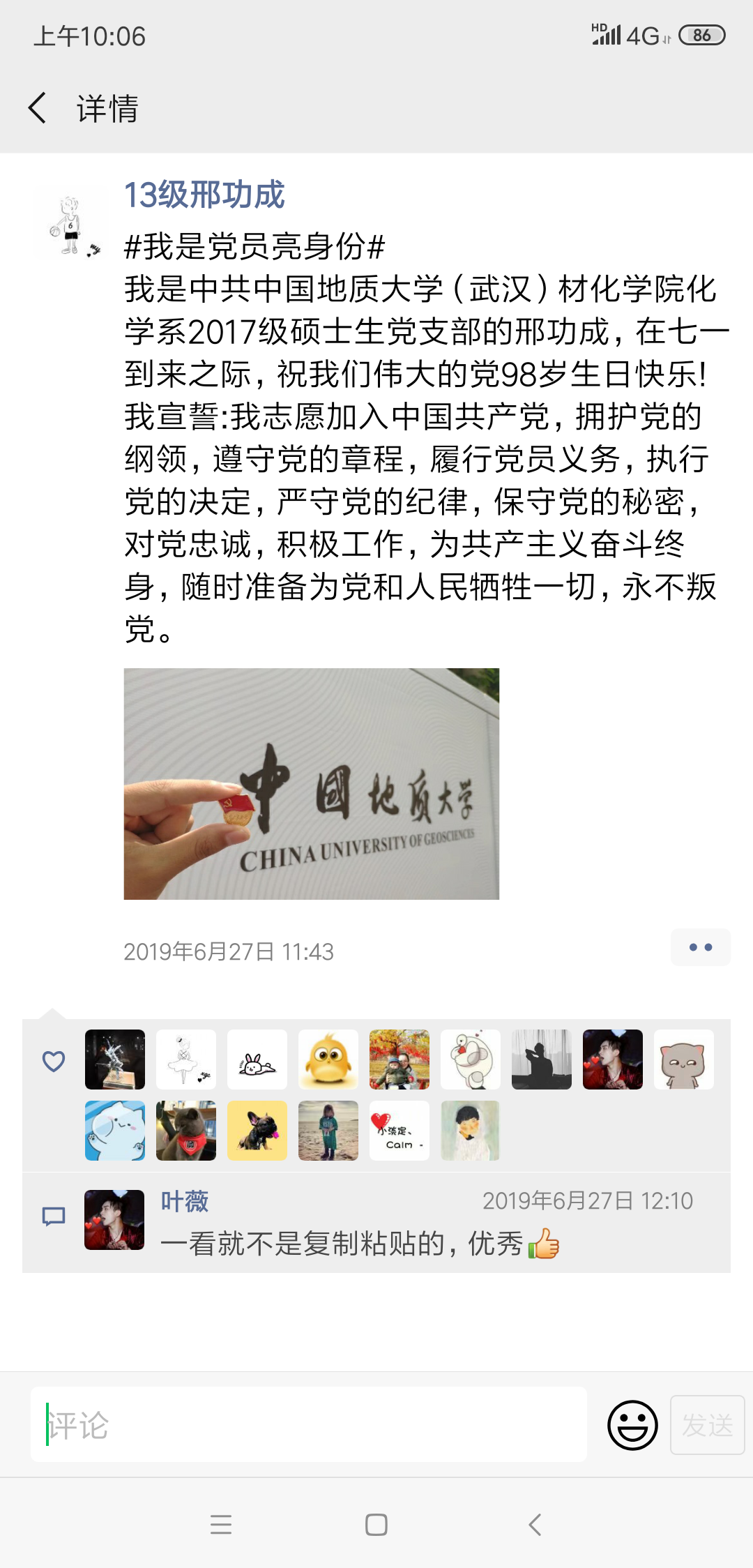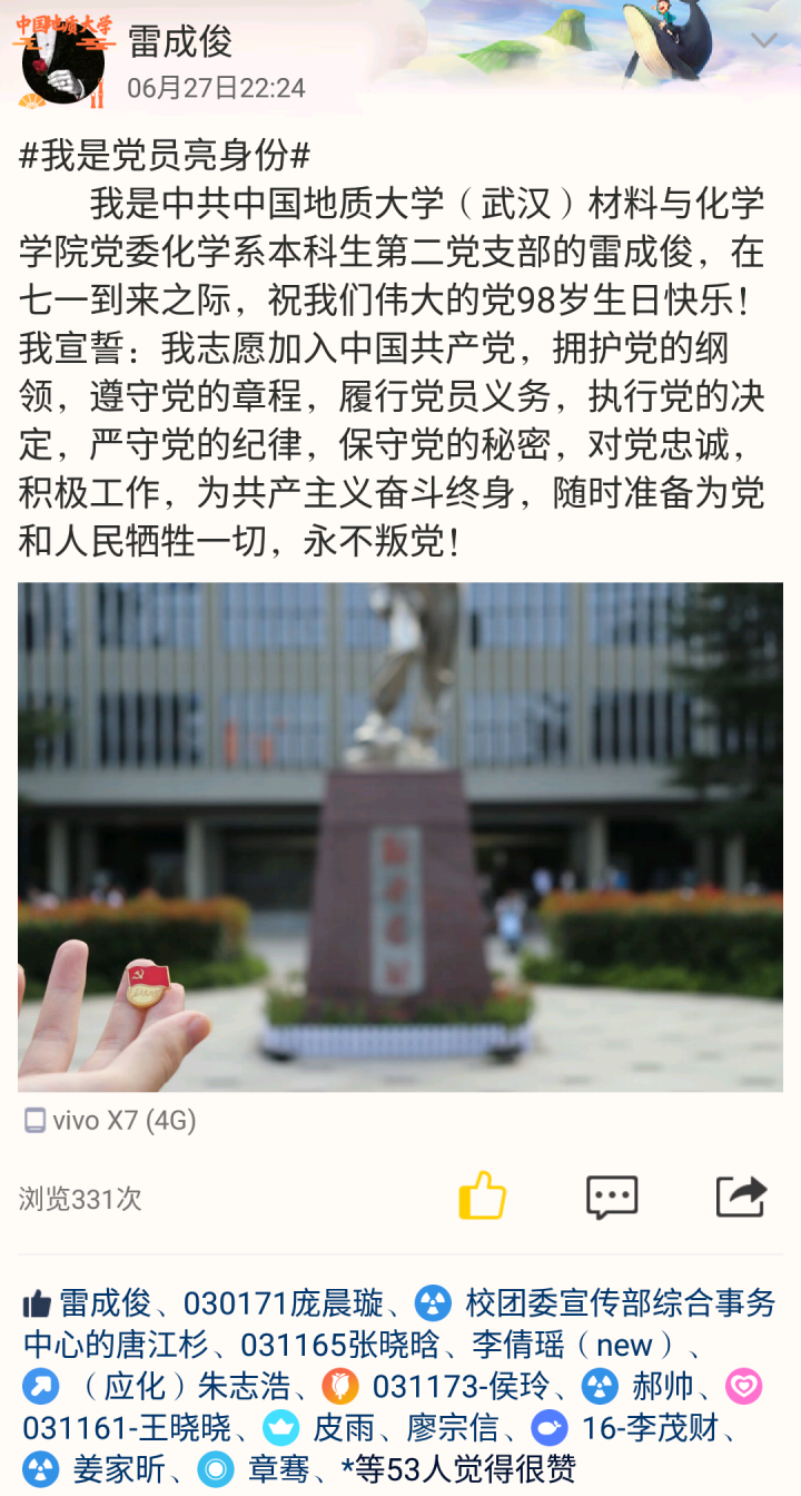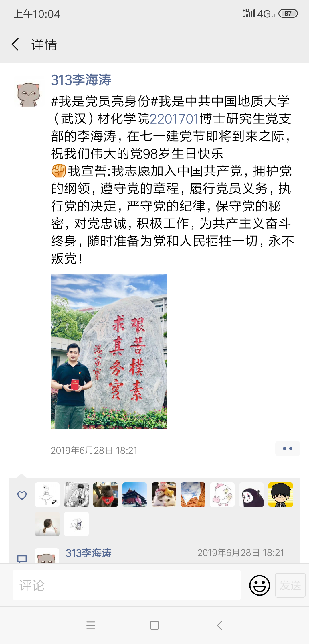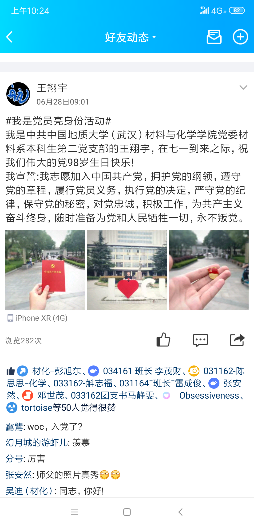材料系18级硕士生党支部的田硕,在七一到来之际,祝我们伟大的党98岁生日快乐!我宣誓:我志愿加入中国共产党,拥护党的纲领,遵守党的章程,履行党员义务,执行党的决定,严守党的纪律,保守党的秘密,对党忠诚,积极工作,为共产主义奋斗终身,随时准备为党和人民牺牲一切,永不叛党。”研究生党员田硕同志在个人QQ空间里发布了一条这样的说说,立马引发很多同学关注,同学们纷纷给说说点赞。当天晚上糖心vlog