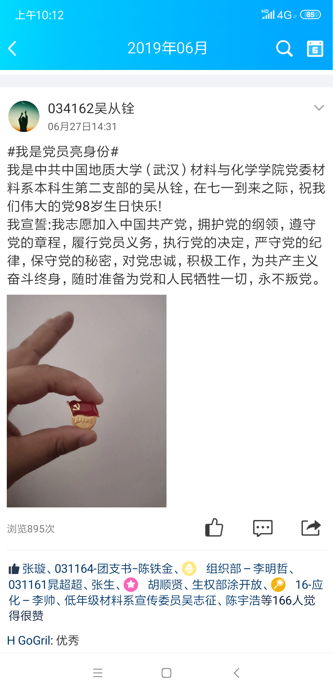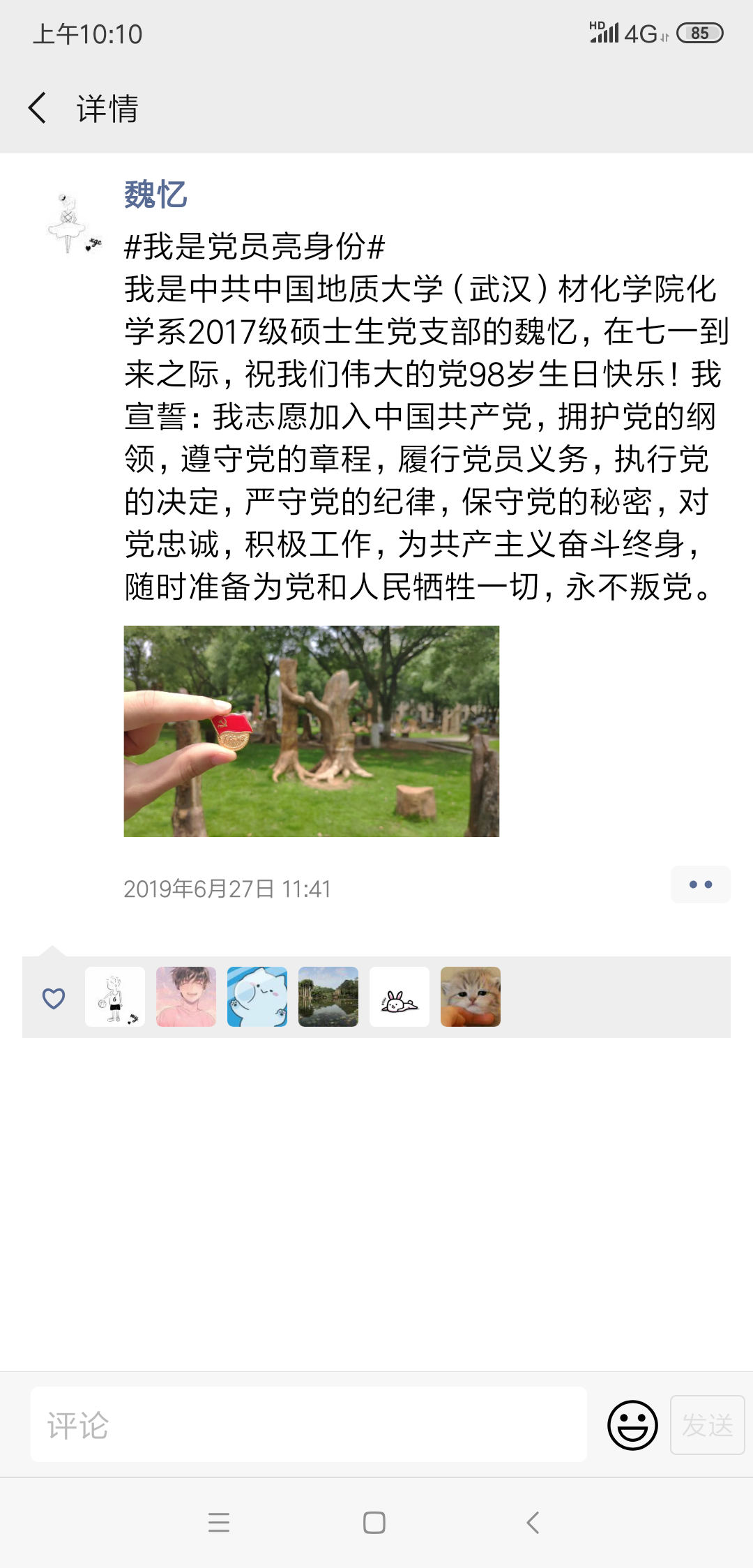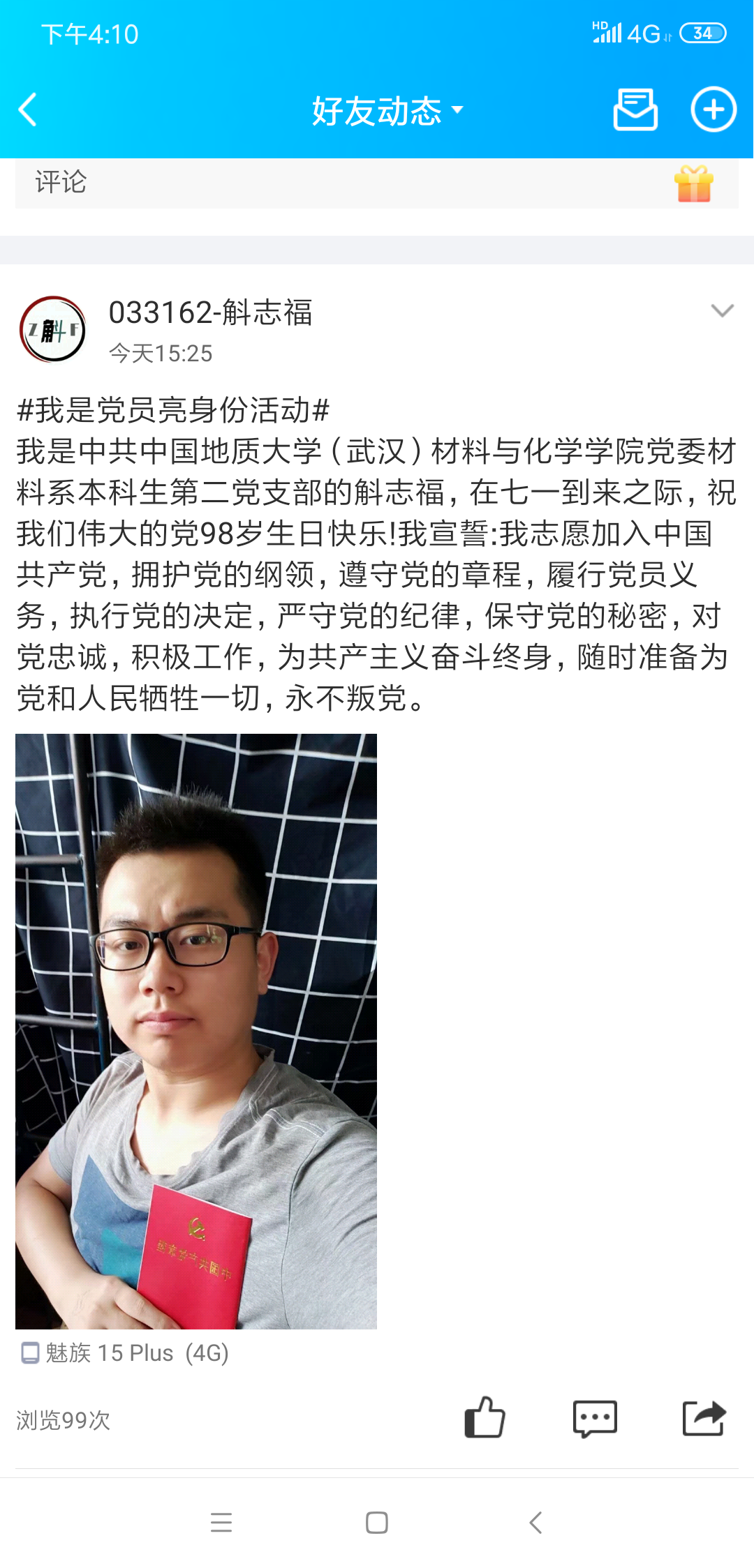 材料系18级硕士生党支部的田硕,在七一到来之际,祝我们伟大的党98岁生日快乐!我宣誓:我志愿加入中国共产党,拥护党的纲领,遵守党的章程,履行党员义务,执行党的决定,严守党的纪律,保守党的秘密,对党忠诚,积极工作,为共产主义奋斗终身,随时准备为党和人民牺牲一切,永不叛党。”研究生党员田硕同志在个人QQ空间里发布了一条这样的说说,立马引发很多同学关注,同学们纷纷给说说点赞。当天晚上糖心vlog