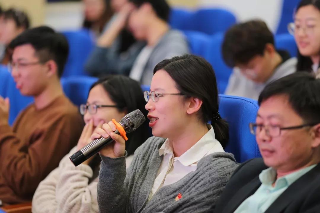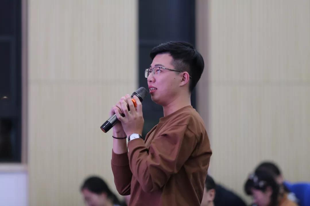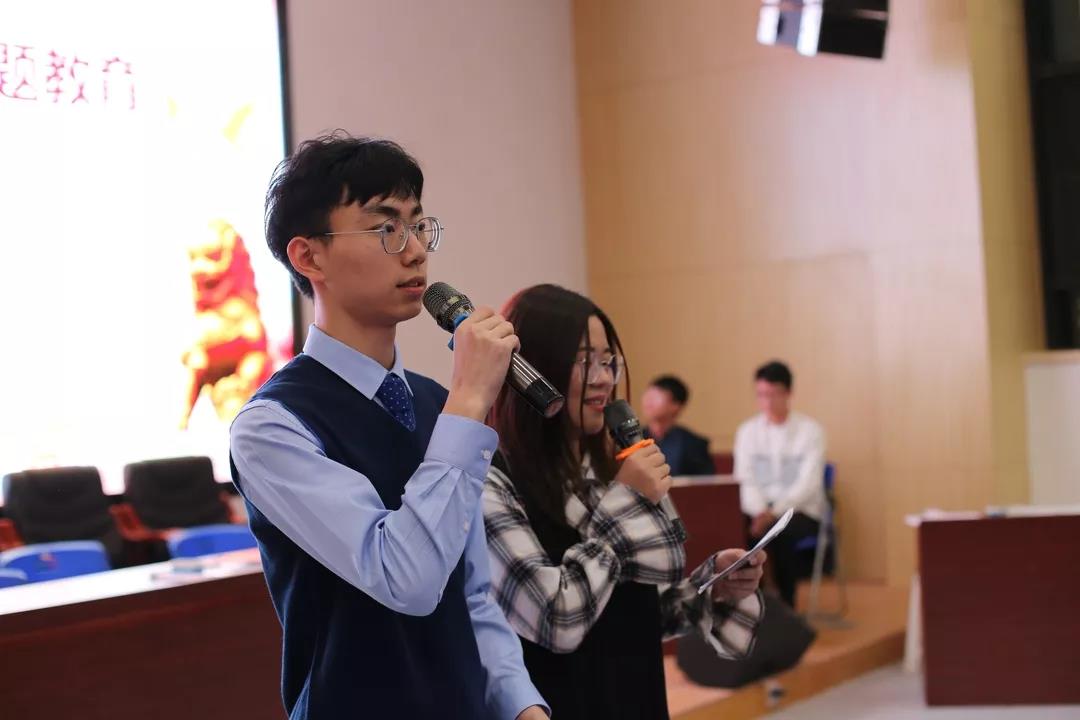 第三部分是风险题,主要考察同学们日常的积累。在这一阶段中,选手们要进行的是红歌接唱,跟一般的理论考察相比更具趣味性。面对熟悉的红歌,大家争相作答,你来我往,不亦乐乎。当《我的祖国》旋律响起时,来自材料系本科第一党支部的斛志福与材料系本科第二党支部的吴从铨在现场激动地携手共同歌唱,全体观众响起了热烈的掌声。