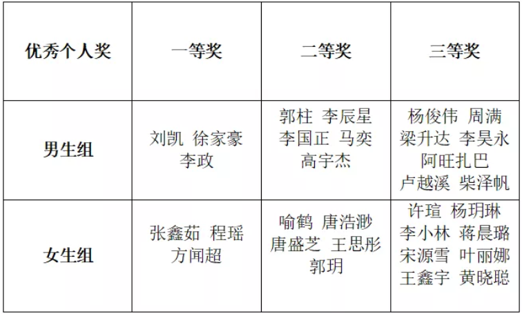 本次比赛分为男生组与女生组,总共参赛人员76人,男生40名,女生36名,男生组项目为俯卧撑,女生项目为仰卧起坐。由文体部成员担任本次比赛的裁判,以一分钟内选手们做出符合标准的次数作为成绩来决定名次。比赛过程中大家自觉遵守竞赛规则,努力寻找最佳状态,经过激烈的角逐和裁判员们的评选及讨论,最终得奖情况如表格所示: