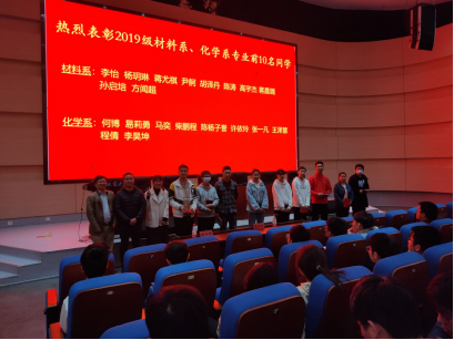 接下来进行的是2020-2021年度学业表彰。余江涛书记和汤鑫军老师给材料系和化学系前10名学生颁发奖状和奖品,合影留恋,并寄语同学们要戒骄戒躁、砥砺前行。