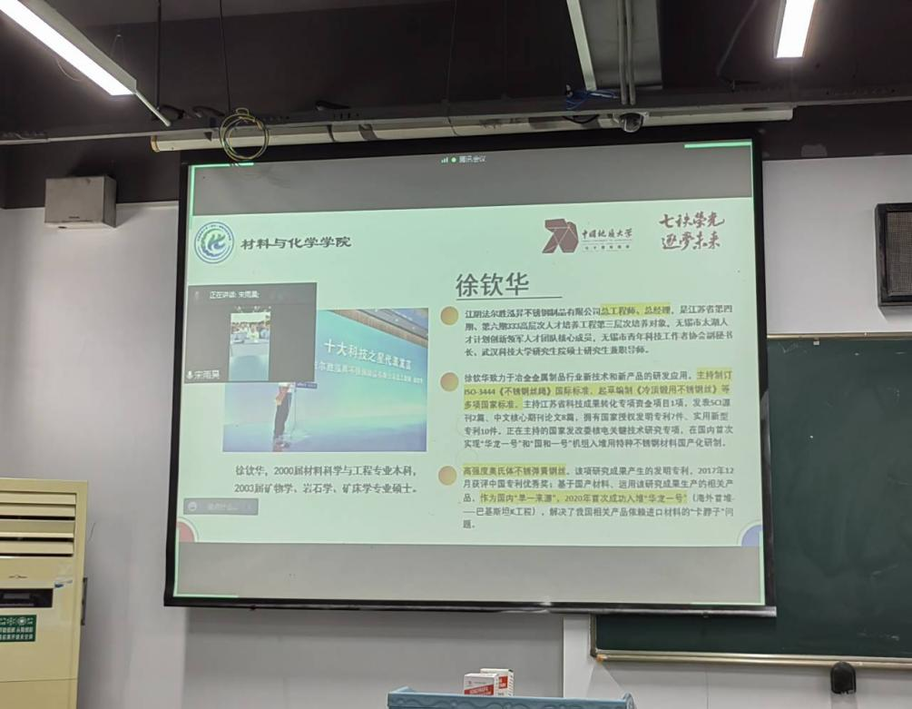 2012届优秀校友,武汉理工大学研究员、博士生导师、华盛顿创新学者、国家高层次青年人才晏梦雨研究员为同学们做分享,材料系主任梁玉军老师主持。