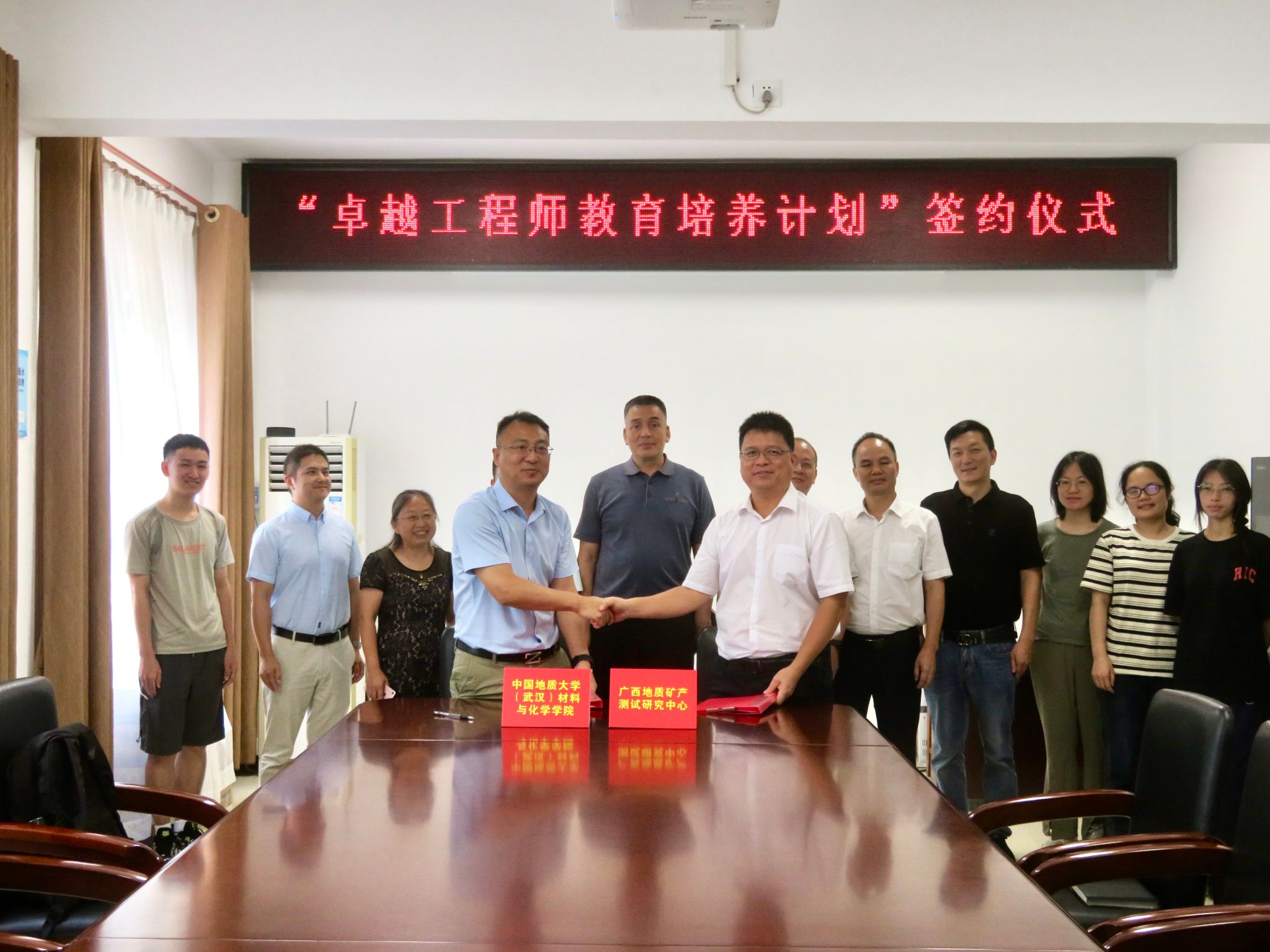 在广西地质矿产测试研究中心,靳洪允副院长一行与广西地矿测试中心主任黄庆柒、党委书记黄有和等中心领导进行座谈。双方分别就人才培养、科研合作和成果转化等内容进行了深入沟通交流,为推动地矿单位与高等院校的“产学研”深度融合和进一步提升学校人才培养质量和单位人才引进打下良好的基础。双方表示,将在科研立项、人才培养和行业标准申报等多方面加强合作,共同为国家新一轮找矿突破战略行动作出新贡献。黄庆柒主任与靳洪允副院长代表双方签署了共建卓越工程师基地合作协议,并为“卓越工程师教育培养计划”培训基地揭牌。