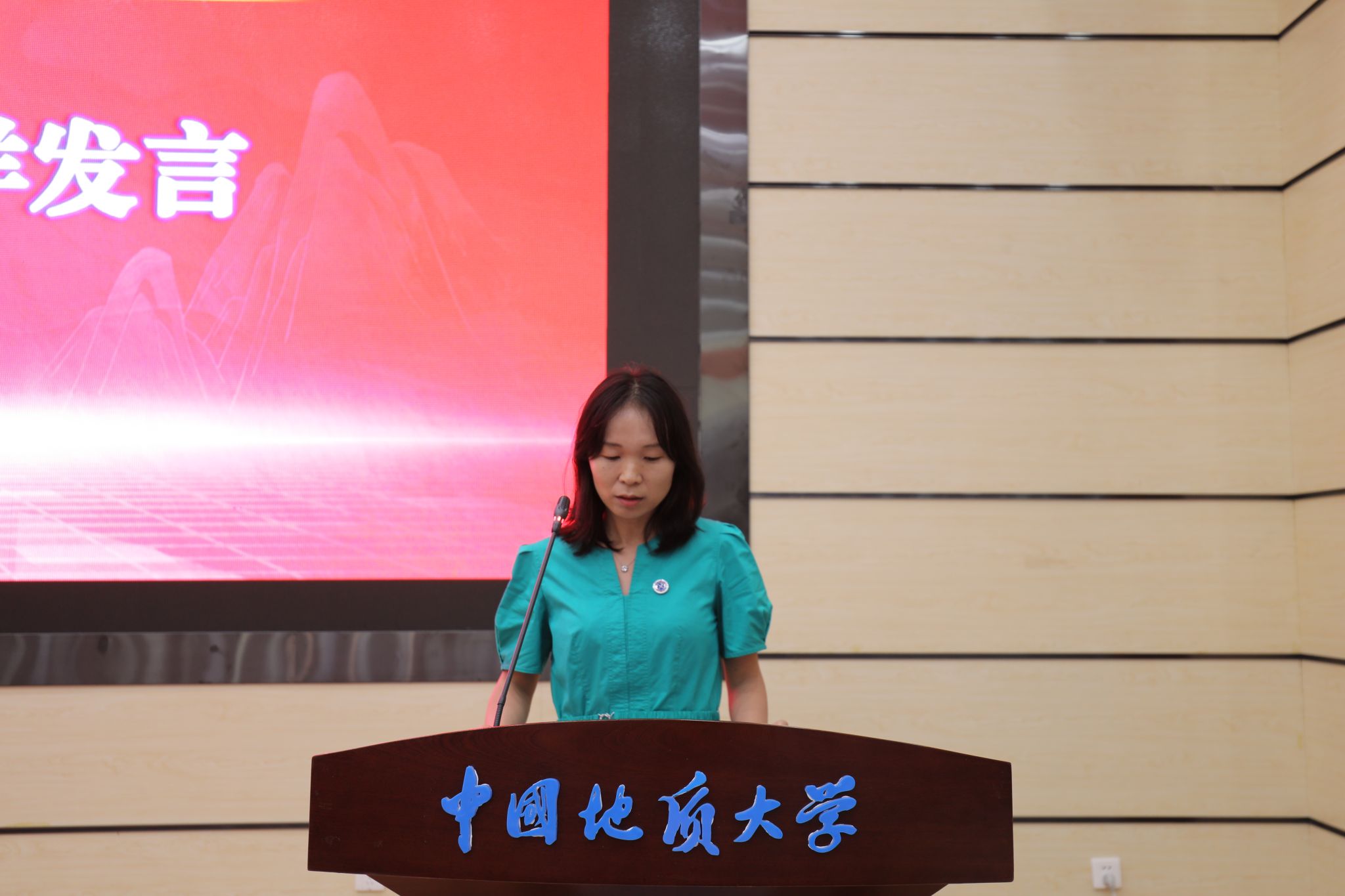 在校生代表、2022级博士研究生车华超发言。他回顾了自己在地大学习生活十年的感悟,他希望同学们在研究生学习中能够正确面对不确定性,沉住气慢慢来,大胆质疑,细心求证,将科研成果有效融入国民经济和社会发展中,把论文写在国家大地上,争做新时代有为地大材化人。