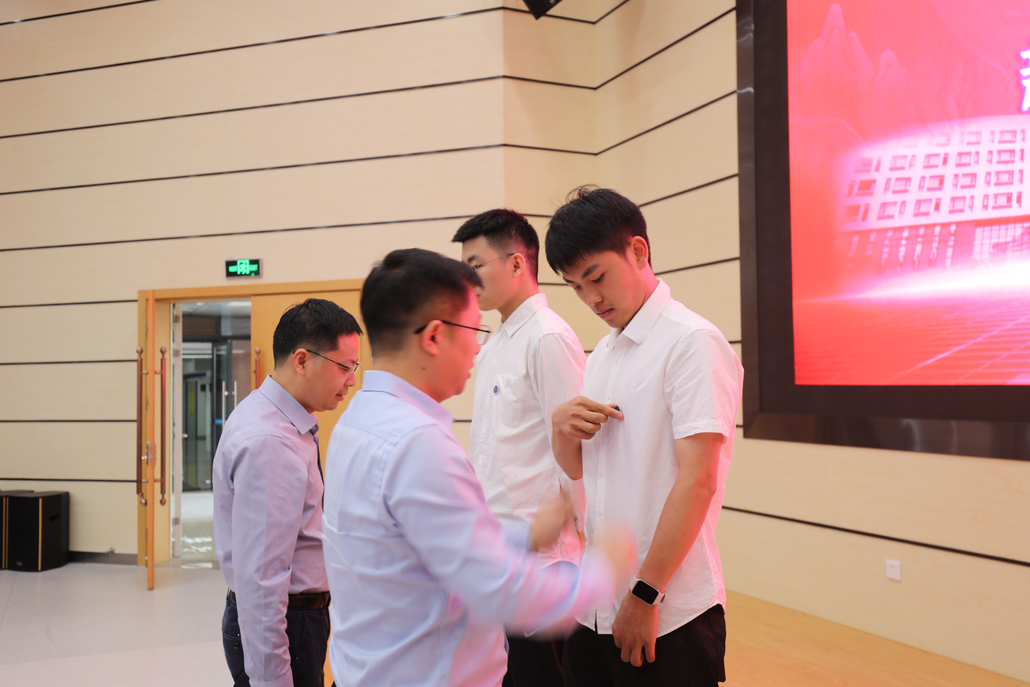 党委书记梁本哲、院长胡兆初为新生代表徐仕军、李彦伯佩戴校徽。